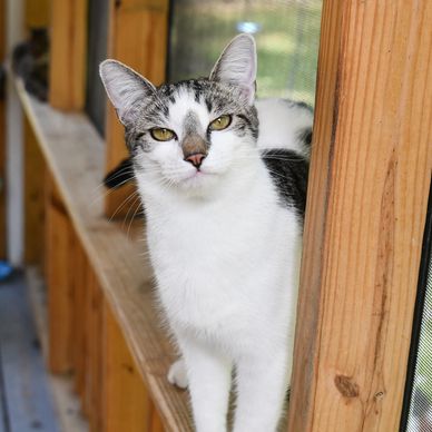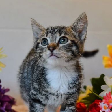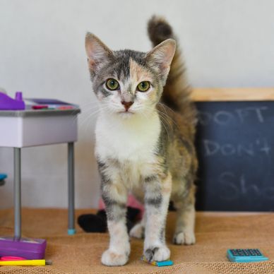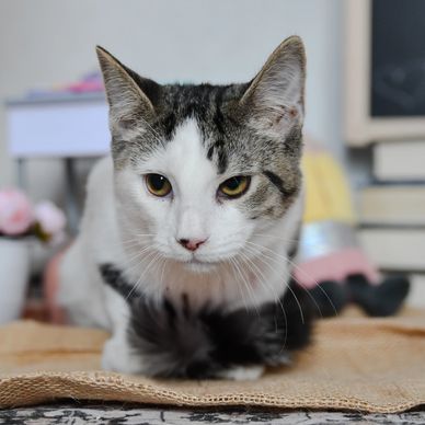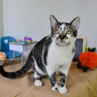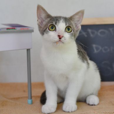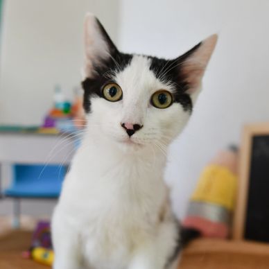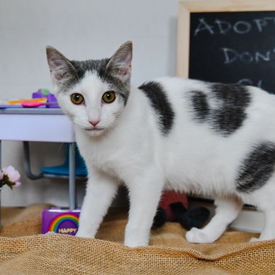 This shy boy is on the lookout for a confident playmate in his forever home! Moo is a playful and fun loving kitten who adores playtime and companionship!